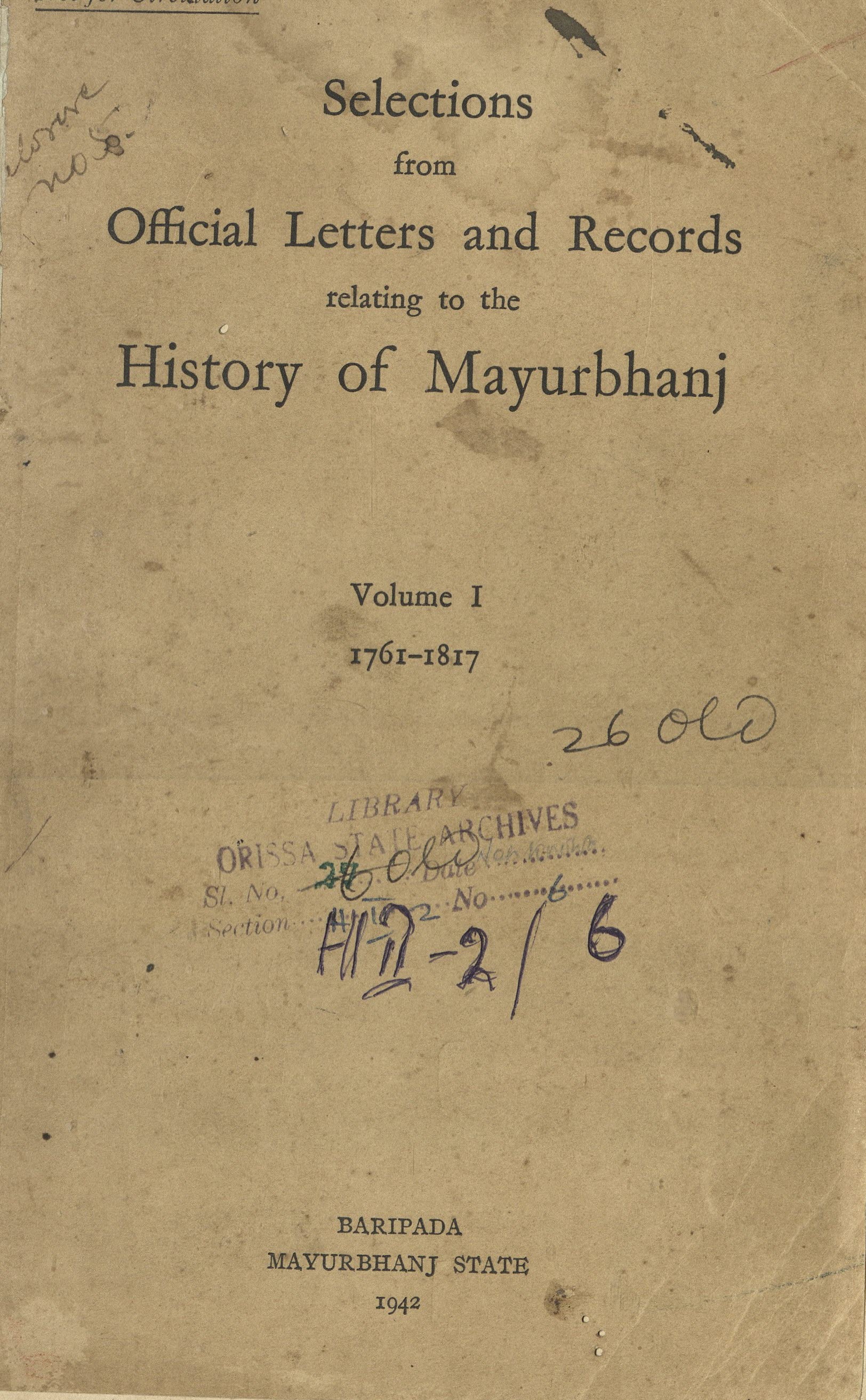 Selections from the Official Letters and Records relating to the History of Mayurbhanja State Vol-1
